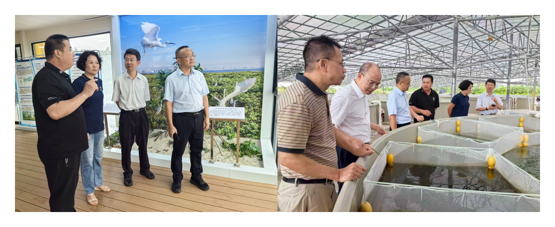 调研组来到广西海洋科学院滨海生态保育与利用创新基地,参观了由广西海洋科学院打造的国内首个路基高质养殖与人工红树林净化湿地生态耦合研发平台。赞扬了将养殖与生态保护协同发展紧密结合的理念,并建议从生态发展角度进行养殖产业的布局。