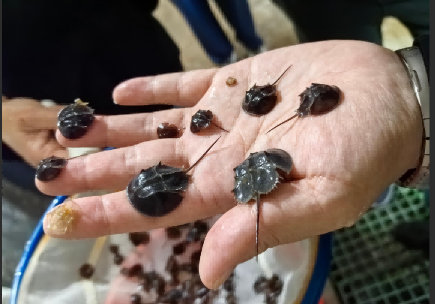 黄洪辉研究员查看不同生长阶段中国鲎人工苗种情况