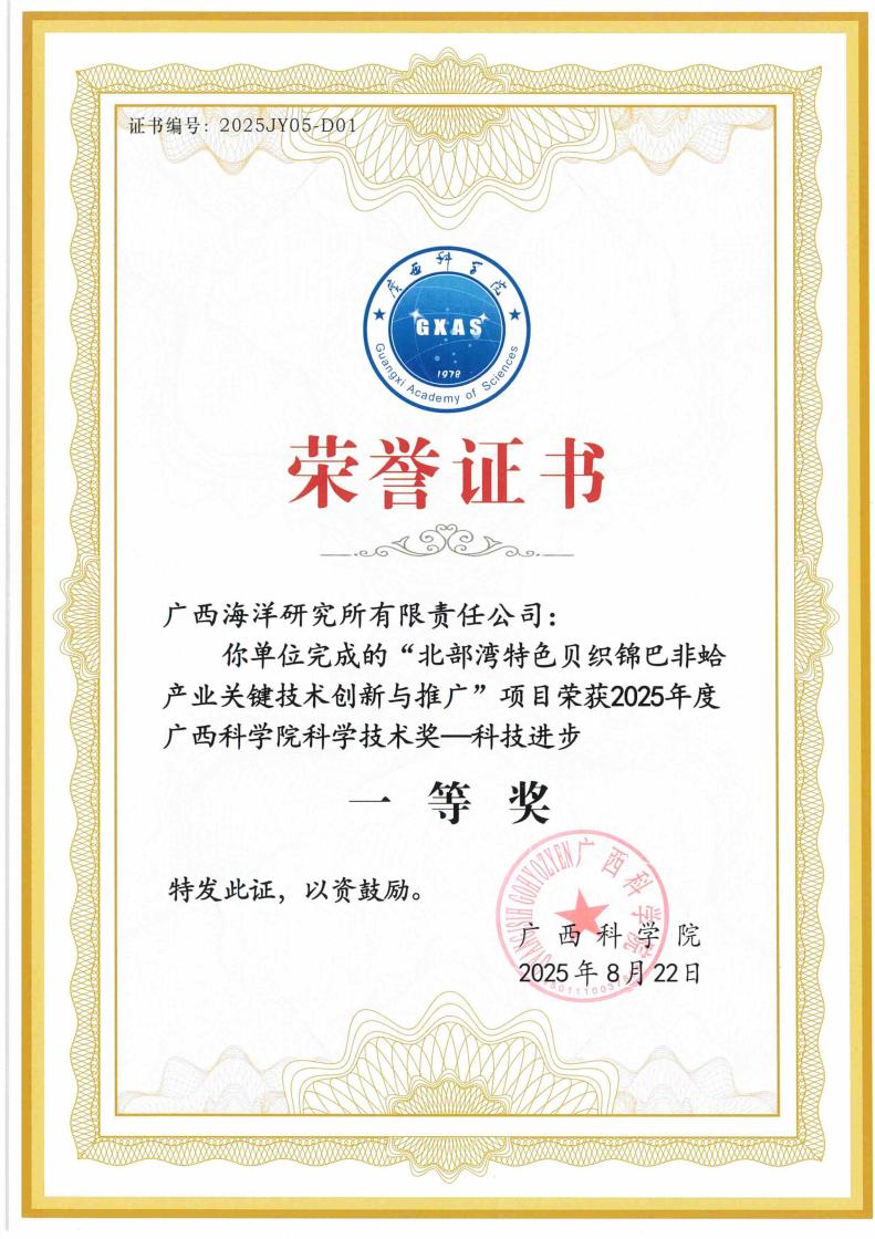 由广西海洋研究所有限责任公司牵头,广西海科院、北海市水产技术推广站,北海金不换水产有限公司共同参与,陈瑞芳总经理负责主持的“北部湾特色贝织锦巴非蛤产业关键技术创新与推广”项目荣获2025年度广西科学院科学技术奖一科技进步一等奖。
